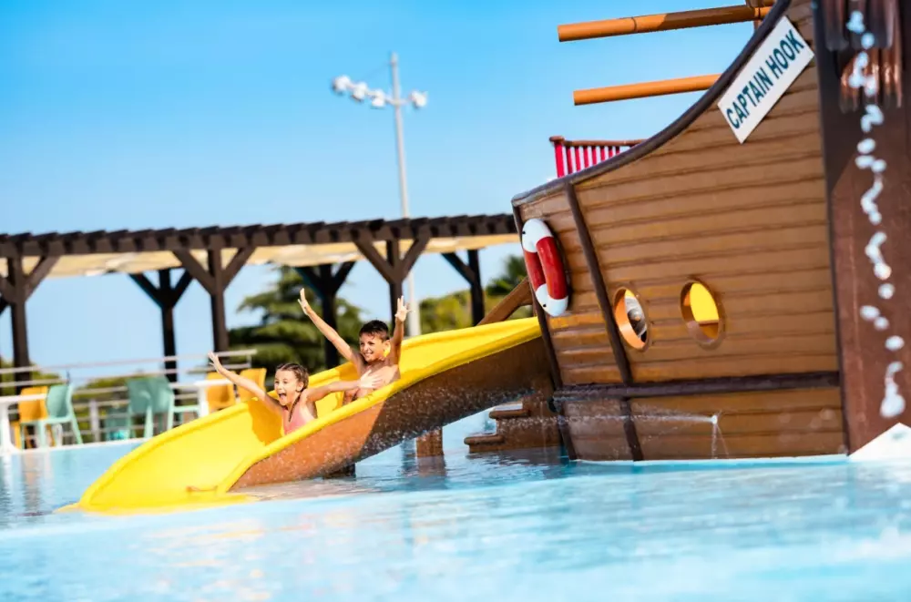 Plongez dans les eaux rafraîchissantes du grand complexe aquatique, qui comprend une piscine, une pataugeoire et un parc de jeux d'eau pour les enfants. Retrouvez le très populaire bateau pirate !