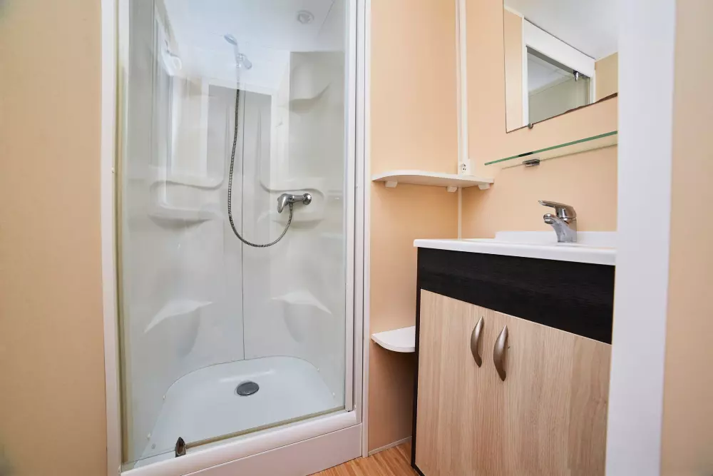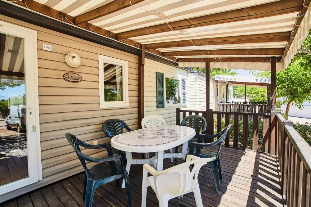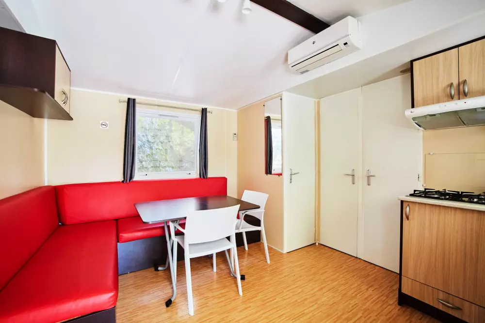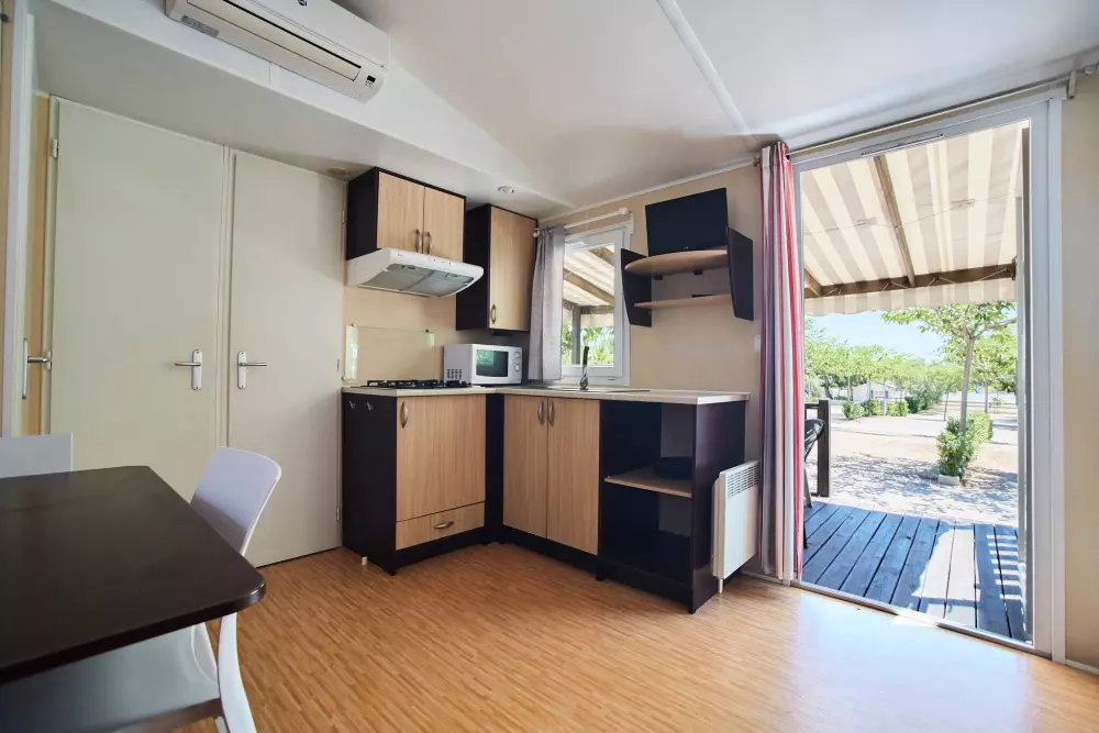 Les bungalows modernes, équipés jusqu'à 6 personnes, disposent de climatisation, terrasse, cuisine, salle de bain complète et salon confortable
