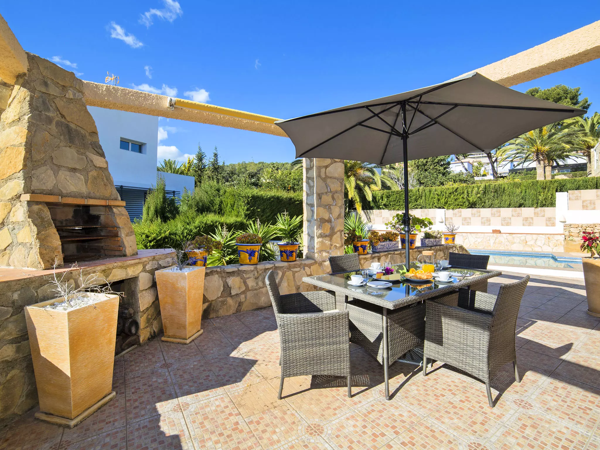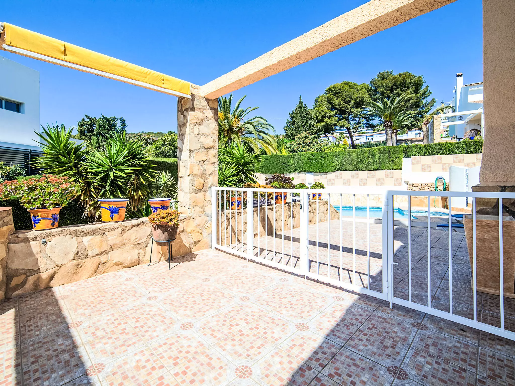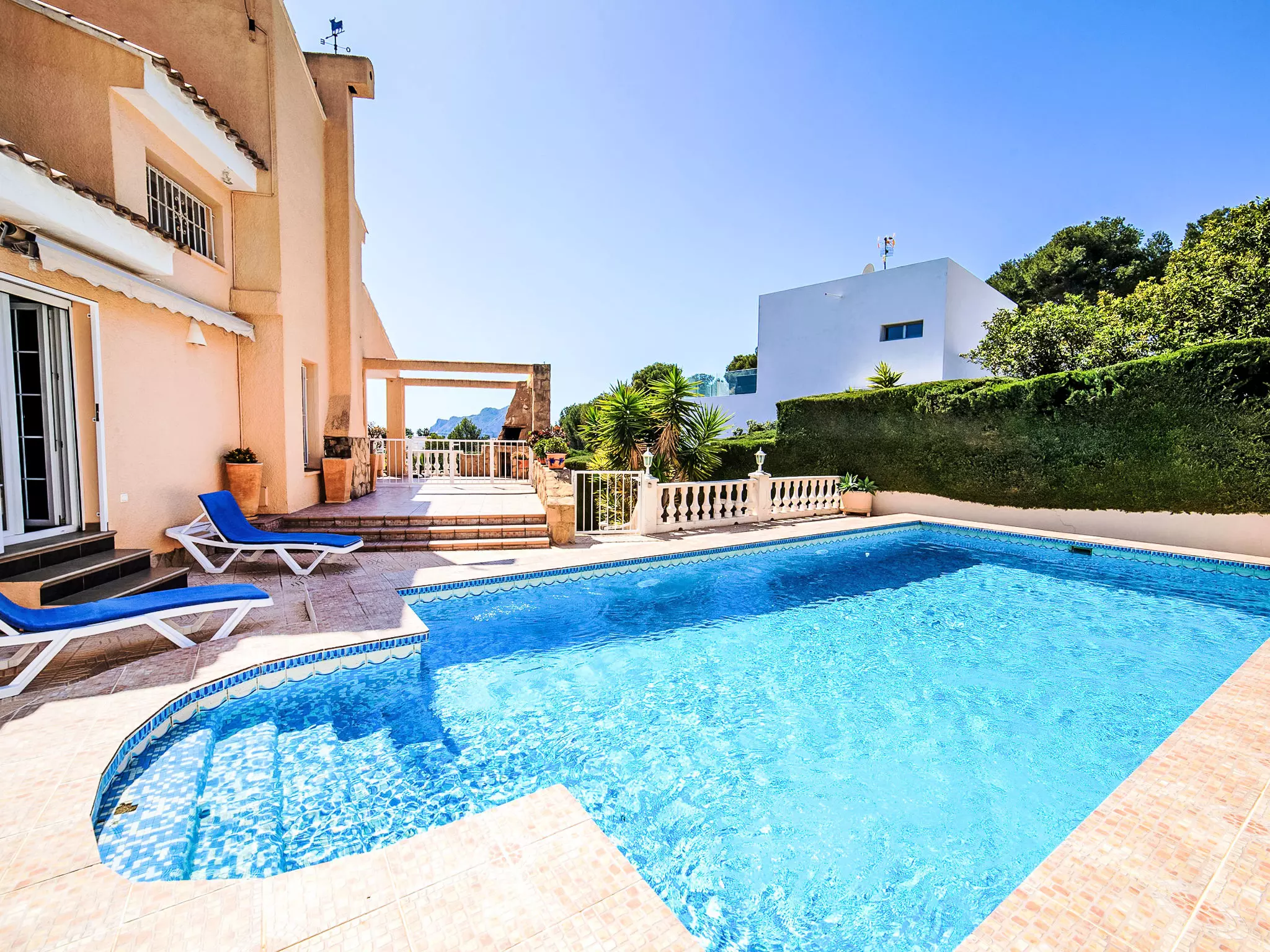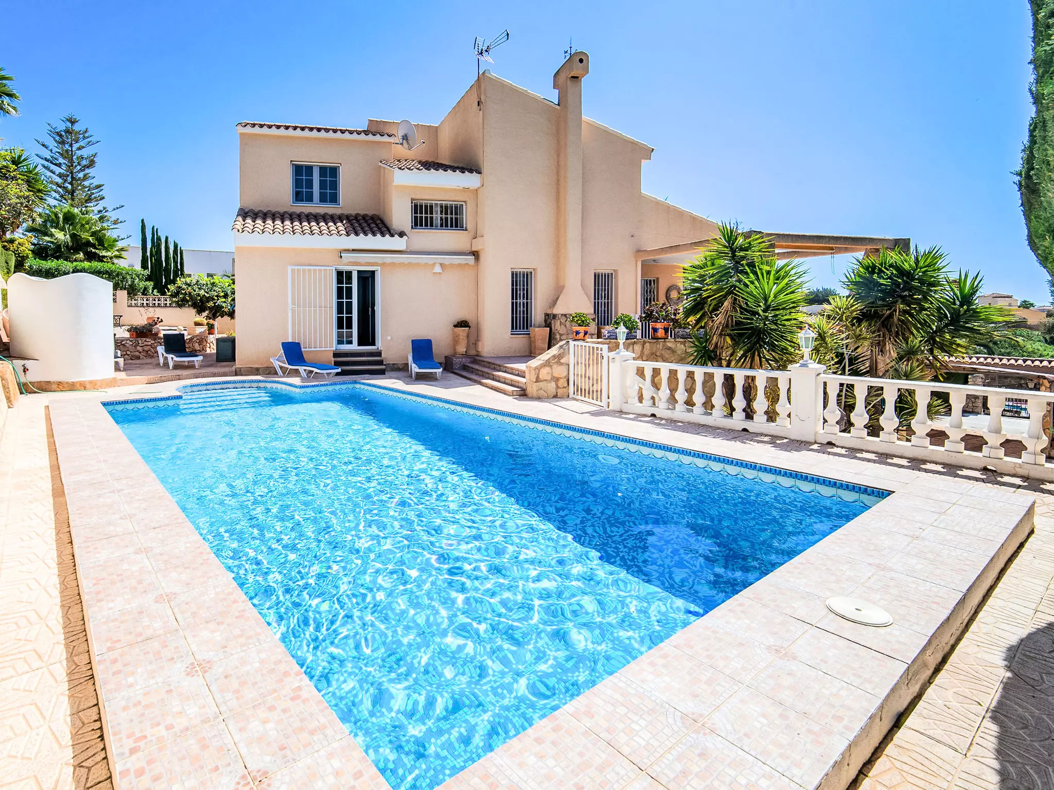 Gran Sol à 3 km de Calpe: Grande maison accueillante pour les enfants "Nadine", de 2 étages. En-dehors de la localité, à 3 km du centre de Calpe, dans l'arrondissement Gran Sol, situation ensoleillée quartier résidentiel, à 1.8 km de la mer, à 1.8 km de la plage. A usage privé: terrain 914 m2 (clôturé), verger, piscine cloturée (4 x 8 m, disponibilité saisonnière: 01.Jan. - 31.Dec.). Douche extérieure, meubles de jardin. Infrastructures de la Maison: lave-linge, possibilité de chauffage uniquement du 01.Nov. - 30.Avr.. Place de parking. Magasins 3.3 km, magasin d'alimentation 3.3 km, supermarché 3.3 km, restaurant 3.1 km, café 3.1 km, biergarten 3.1 km, arrêt de bus "Parroqui La Merced" 2.6 km, plage de sable "Playa La Fustera" 1.8 km, crique pour baignade 1.8 km. Port plaisance 2.6 km, marina 2.6 km, ecole de surf 2.6 km, ecole de voile 2.6 km. Attractions à proximité: Peñon d'Ifach 5.4 km, Parque Las Salinas 4.8 km. Région de randonnées: Sendero la Calaga 2.6 km. Veuillez noter: voiture recommandée. Adapté(e) aux familles. Le propriétaire n'accepte pas les groupes de jeunes.