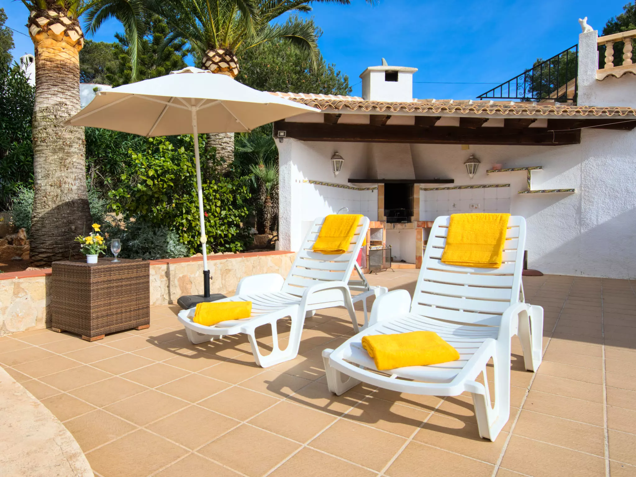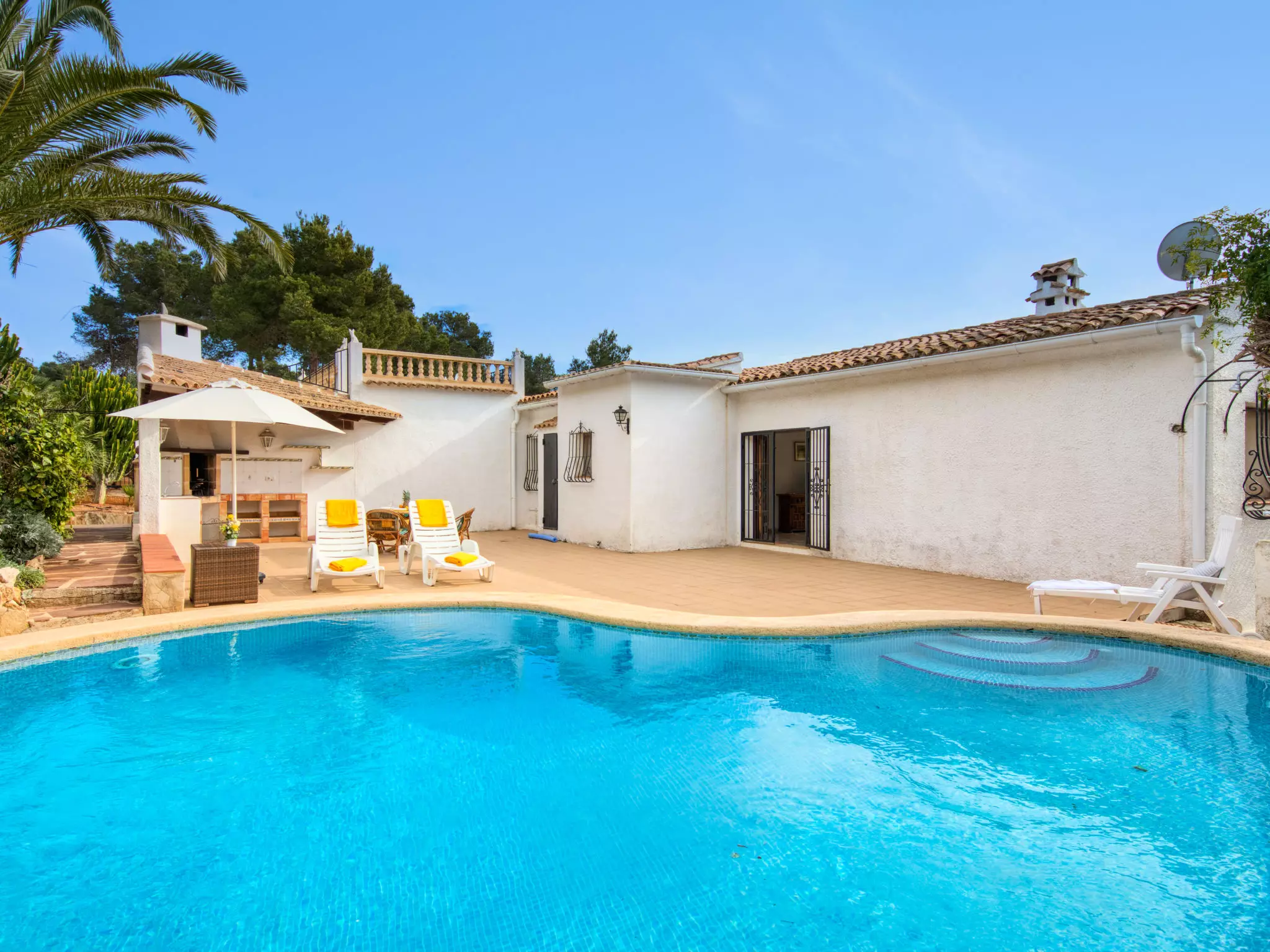 Maison "La Concha". Dans le quartier de Panorama, à 5 km de la mer. A usage privé: jardin 985 m2 (pas clôturé) avec plantes et fleurs, piscine en forme d'haricot (4 x 7 m, profondeur 90 - 160 cm, disponibilité saisonnière: 01.Jan. - 31.Dec.) avec marches intérieures. Douche extérieure. Infrastructures de la Maison: terrasse sur le toit. Restaurant, bar 600 m, arrêt de bus "Toscamar" 2.8 km, plage de sable "Arenal" 5 km, crique pour baignade 3.5 km. Tennis 600 m. Groupes de jeunes sur demande seulement.