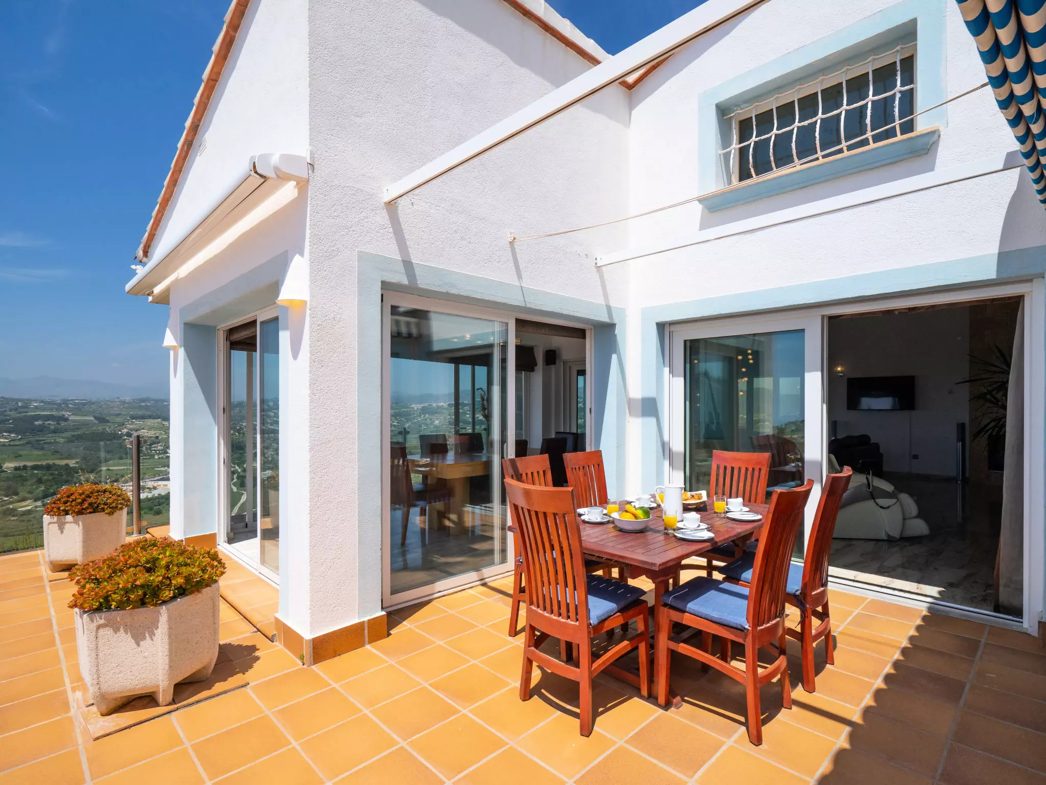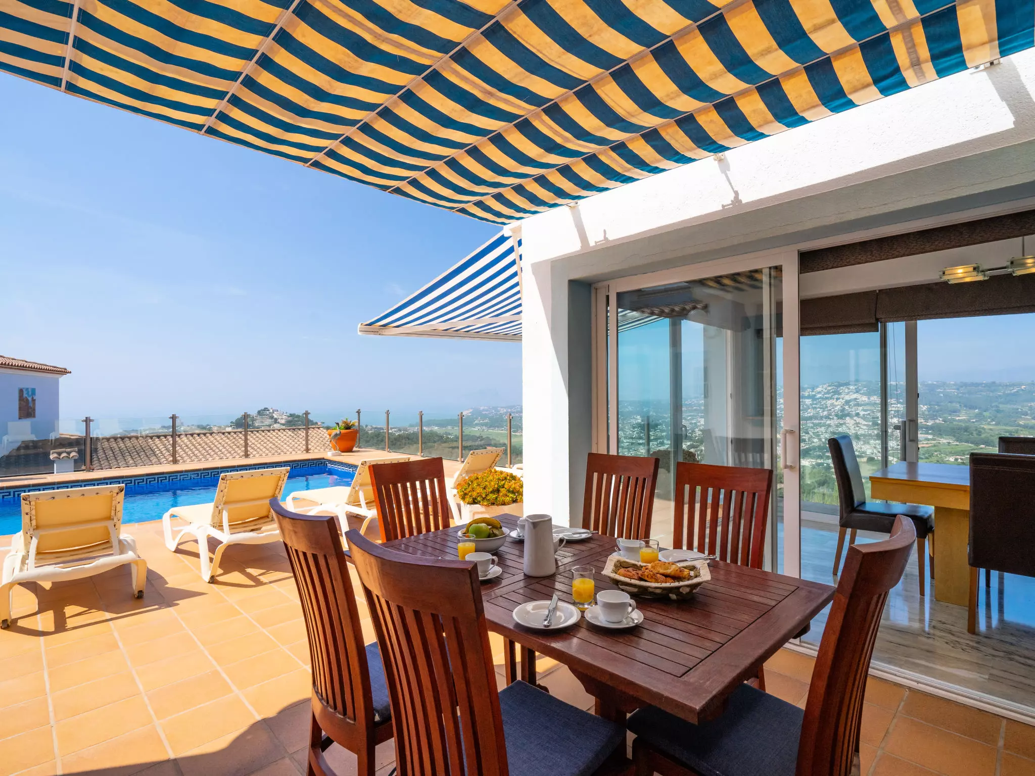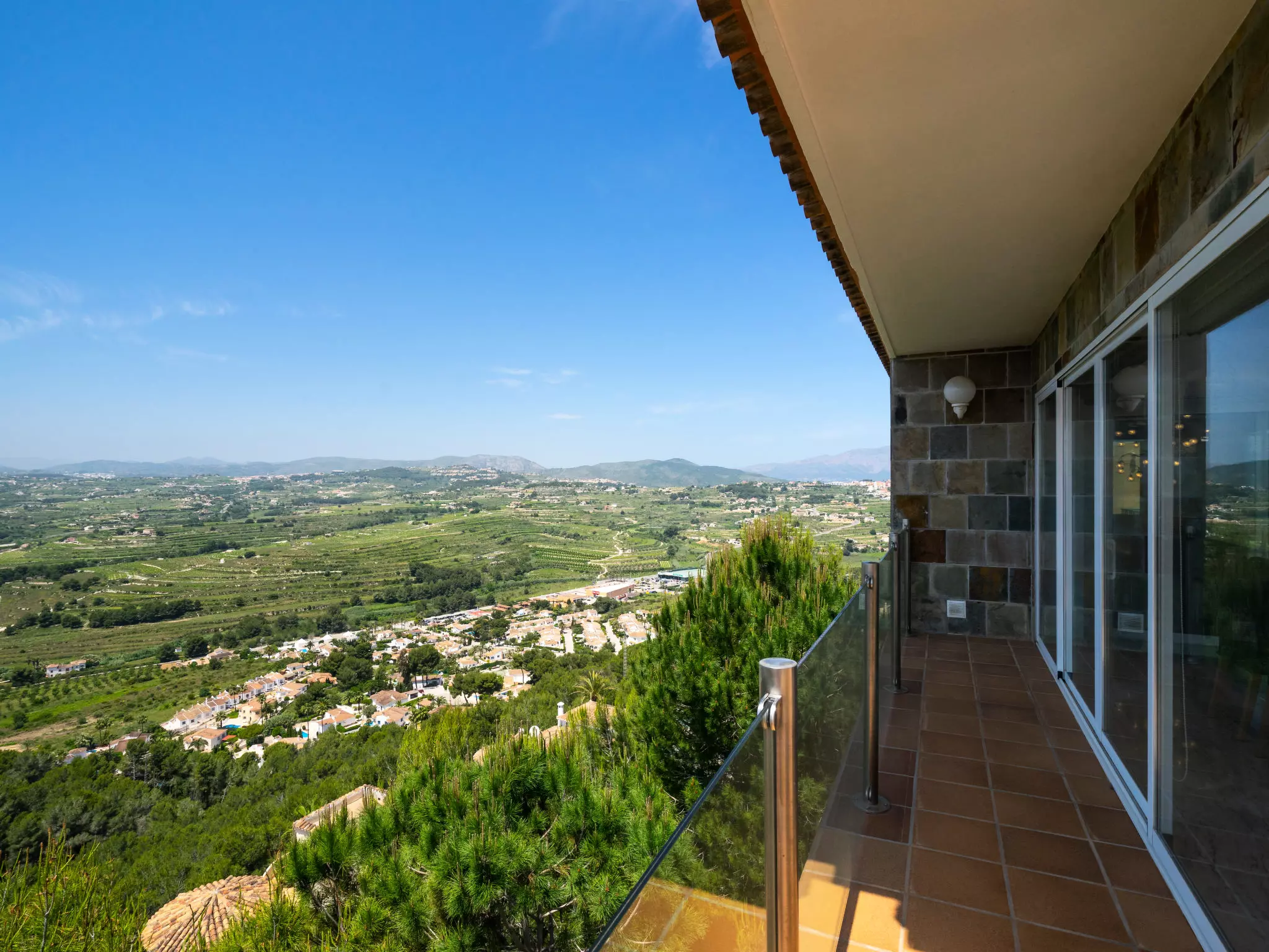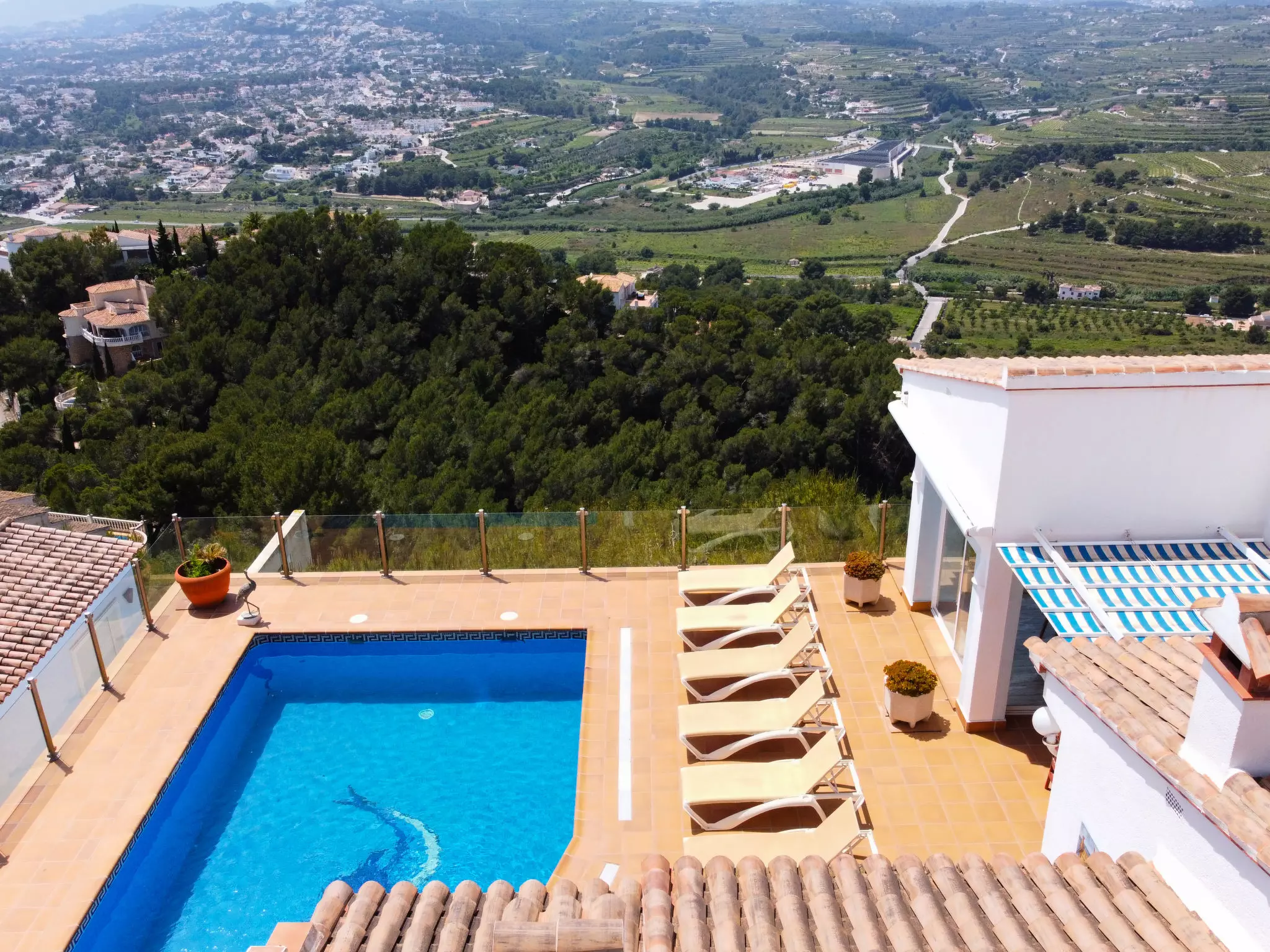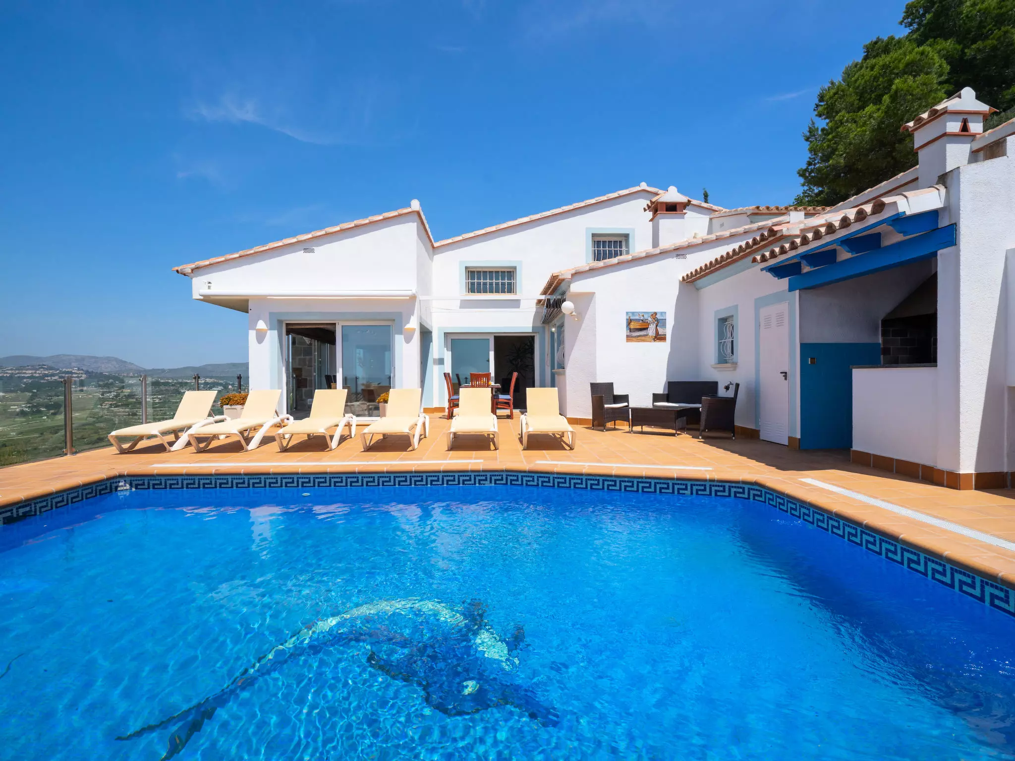 Golden Valley: Belle maison luxueuse "Stuttgart". À 4.5 km du centre de Moraira, situation tranquille, ensoleillée, surélevée, à 4.5 km de la mer, dans une impasse. A usage privé: terrain 1'100 m2 (clôturé), piscine à l'abri des regards (35 m2, disponibilité saisonnière: 01.Jan. - 31.Dec.) avec marches intérieures. Terrasse, meubles de jardin, espace barbecue. Infrastructures de la Maison: sauna, salle fitness, bain à remous , chauffage central. Place de parking (couvert). Supermarché 1.3 km, restaurant 1.3 km, bar 1.3 km, arrêt de bus "Moraira" 4.1 km, gare ferroviaire "Teulada" 6.3 km, ferry "Denia" 22.4 km, plage de sable "Moraira" 4.5 km. Terrain de golf (18 trous) 9 km. Le propriétaire n'accepte pas les groupes de jeunes.