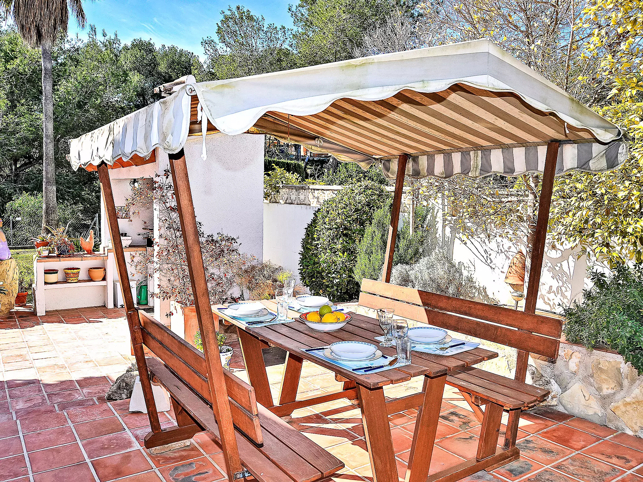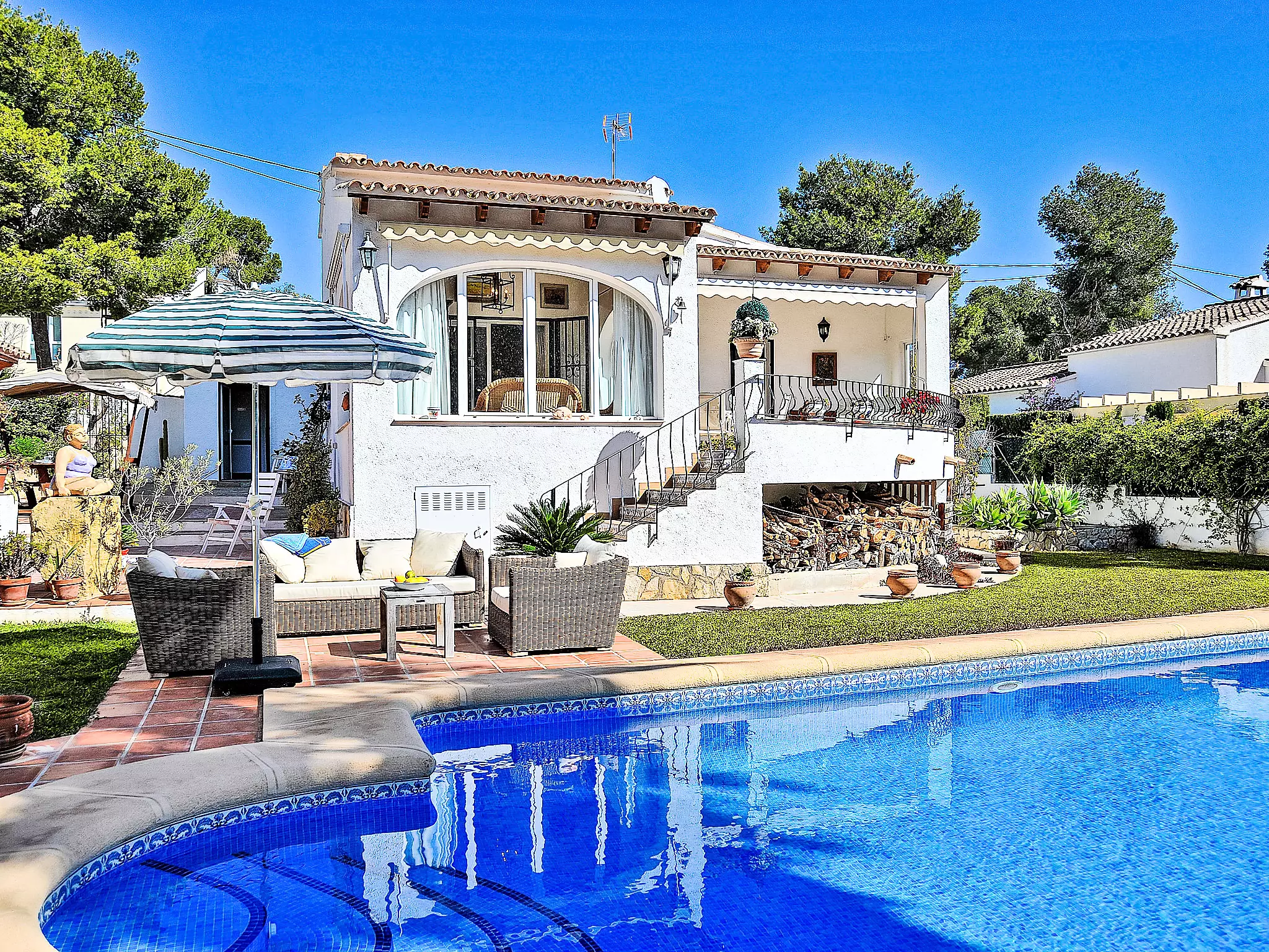 Pinar de l'Advocat: Belle maison "El sueno de Jeanne-Marie". À 1 km du centre de Moraira, à 1 km de la mer, à 1 km de la plage. A usage privé: beau jardin entretenu (clôturé) avec pelouse, piscine rectangulaire (4 x 8 m, profondeur 120 - 210 cm, disponibilité saisonnière: 01.Jan. - 31.Dec.) avec marches intérieures. Terrasse, barbecue. Infrastructures de la Maison: chauffage central, air-conditionné. Place de parking sur le terrain. Magasins 1 km, supermarché 1 km, restaurant 50 m, bar 1 km, arrêt de bus 1.5 km, plage de sable 1 km. Terrain de golf (18 trous) 5 km. Veuillez noter: adapté(e) aux familles, indiqué pour séniors. Le propriétaire n'accepte pas les groupes de jeunes.