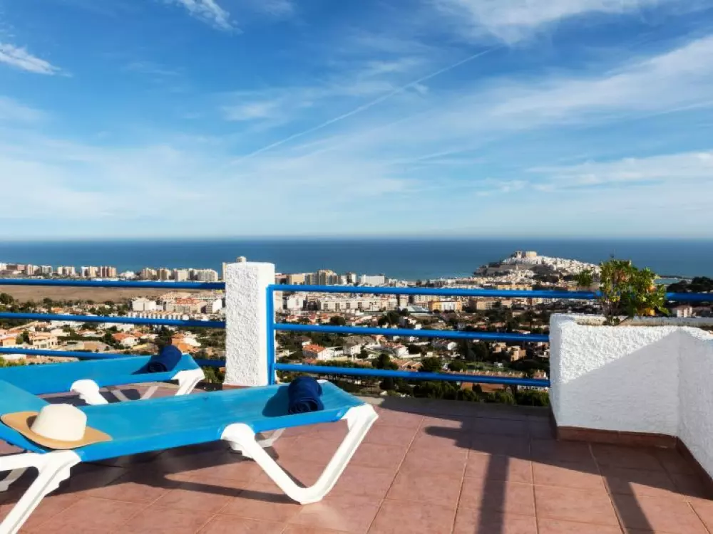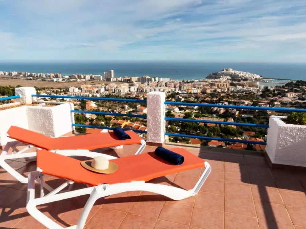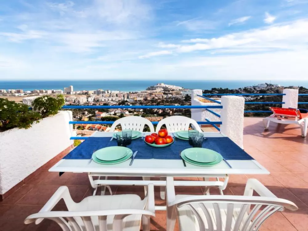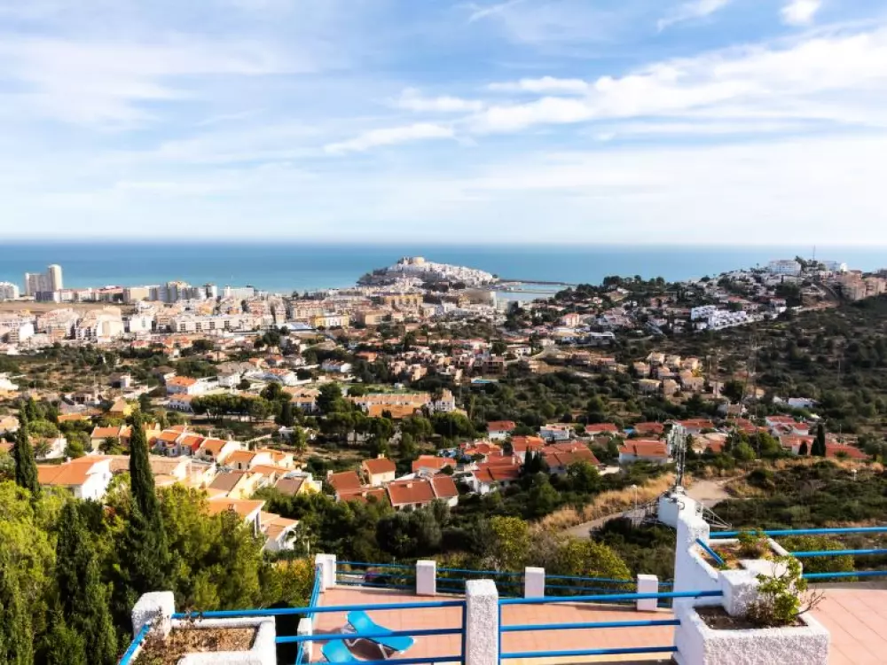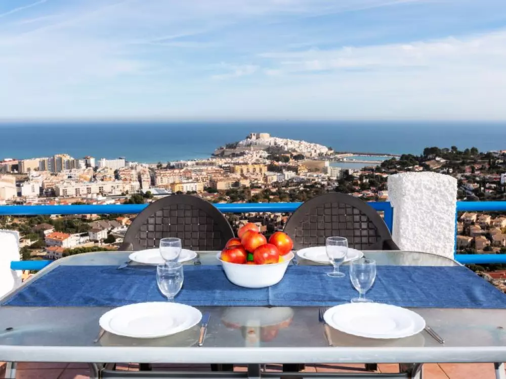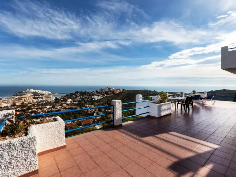 Maison à 3 apts "Karina". 3 appartements dans la même entité. Dans le haut de la station de Peñiscola, dans le quartier de Las Atalayas, à 2.5 km du centre de Peñiscola, à 130 km du centre de Valencia, à 130 km du centre de Tarragona, sur un versant, à 2.5 km de la mer. En commun: terrain 700 m2 avec plantes, piscine (11 x 5 m, disponibilité saisonnière: 01.Jun. - 15.Oct.). Douche/WC dans l'espace piscine, douche extérieure, terrasse, barbecue, parking public possible dans la rue. Supermarché 1.5 km, restaurant 1.5 km, arrêt de bus "Plaza de la Constitución" 2.5 km, gare ferroviaire "Benicarló-Peñíscola" 10 km, plage de sable "Playa Sur-Playa Norte" 2 km. Terrain de golf (18 trous) 30 km. Attractions à proximité: Peñiscola 2 km, Museo de las Artes y las Ciencias 125 km, Delta del Ebro 40 km, Port Aventura 100 km. Région de randonnées: Parque Natural Sierra d'Irta 5 km. Groupes de jeunes sur demande seulement.