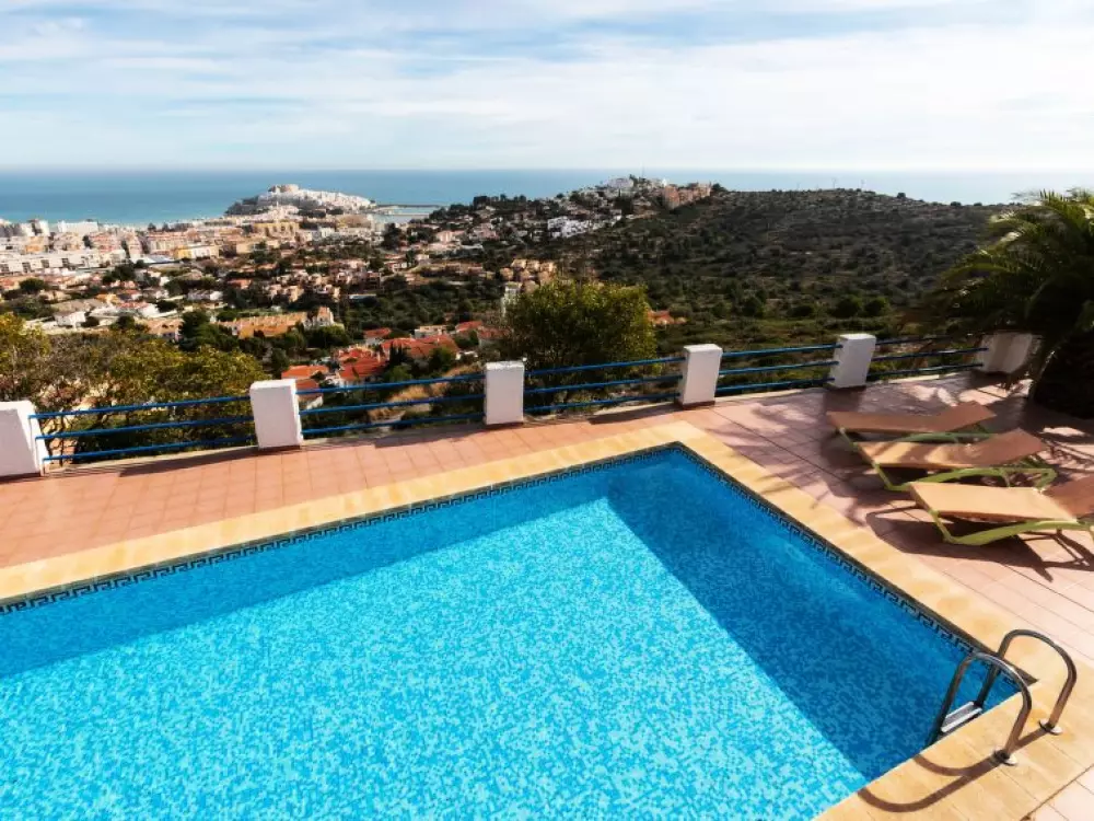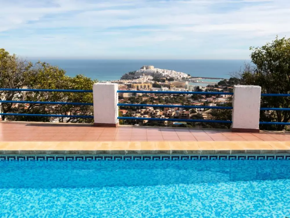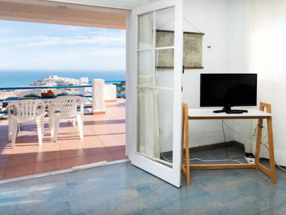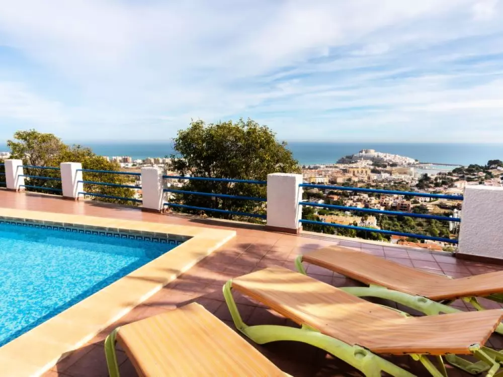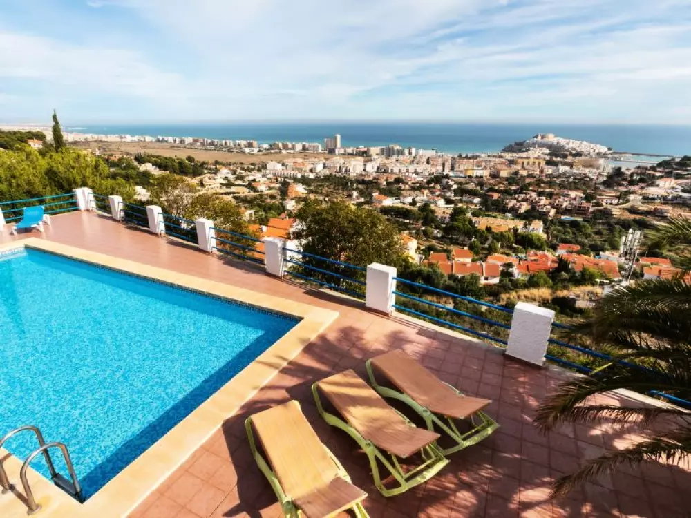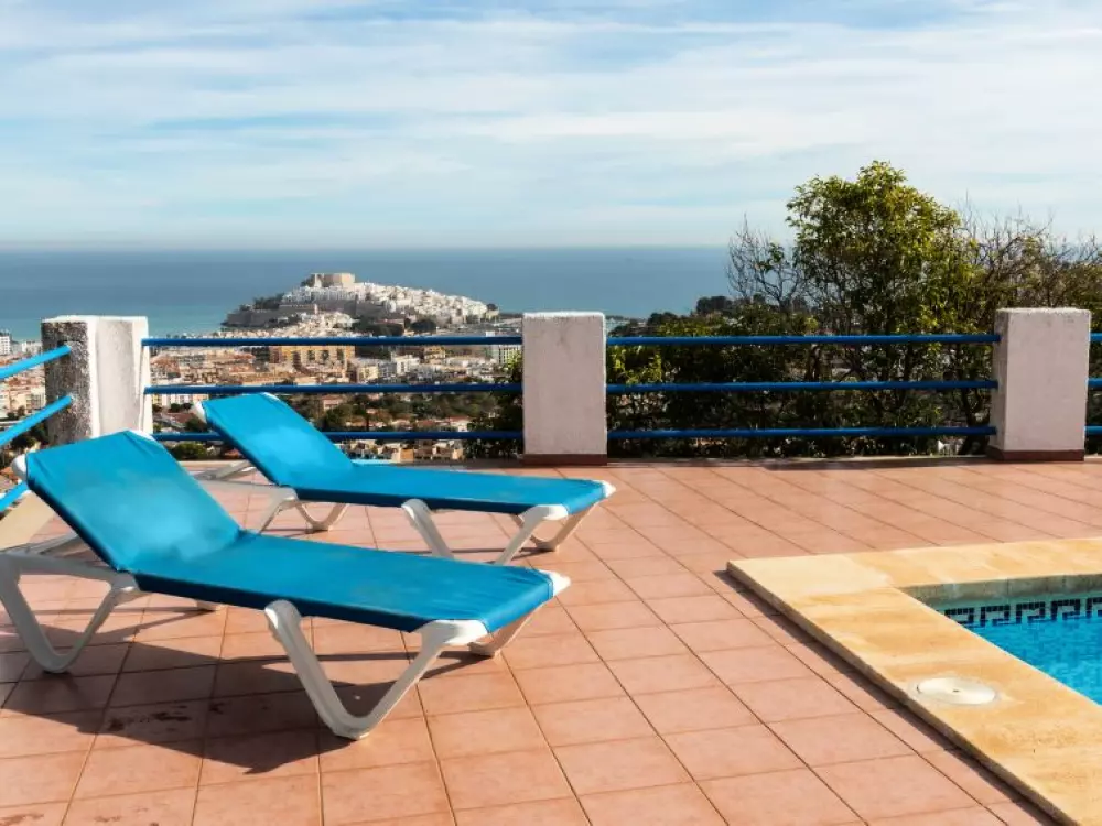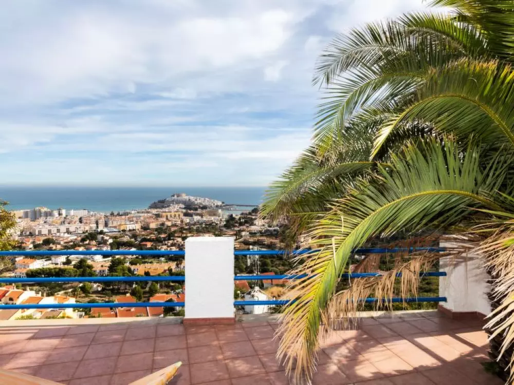 Maison à 3 apts "Karina". 3 appartements dans la même entité. Dans le haut de la station de Peñiscola, dans le quartier de Las Atalayas, à 2.5 km du centre de Peñiscola, à 130 km du centre de Valencia, à 130 km du centre de Tarragona, sur un versant, à 2.5 km de la mer. En commun: terrain 700 m2 avec plantes, piscine (11 x 5 m, disponibilité saisonnière: 01.Jun. - 15.Oct.). Douche/WC dans l'espace piscine, douche extérieure, terrasse, barbecue, parking public possible dans la rue. Supermarché 1.5 km, restaurant 1.5 km, arrêt de bus "Plaza de la Constitución" 2.5 km, gare ferroviaire "Benicarló-Peñíscola" 10 km, plage de sable "Playa Sur-Playa Norte" 2 km. Terrain de golf (18 trous) 30 km. Attractions à proximité: Peñiscola 2 km, Museo de las Artes y las Ciencias 125 km, Delta del Ebro 40 km, Port Aventura 100 km. Région de randonnées: Parque Natural Sierra d'Irta 5 km. Groupes de jeunes sur demande seulement.