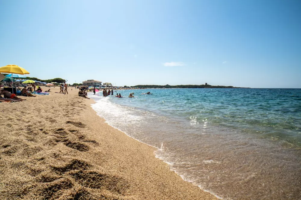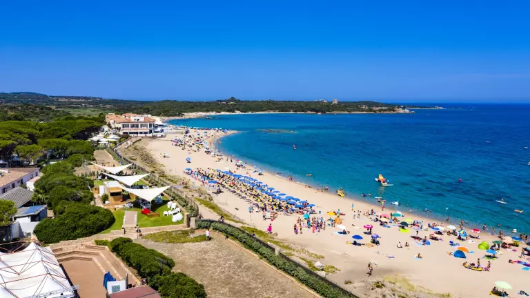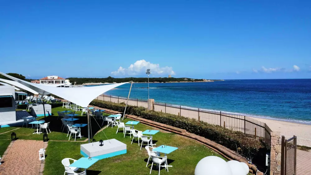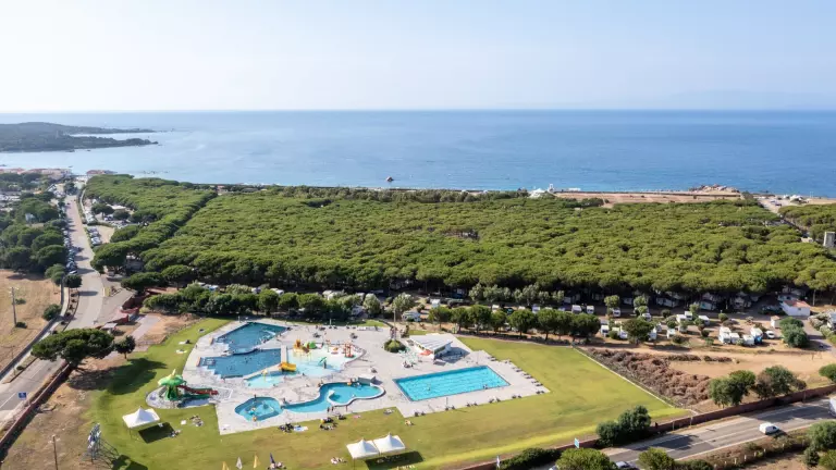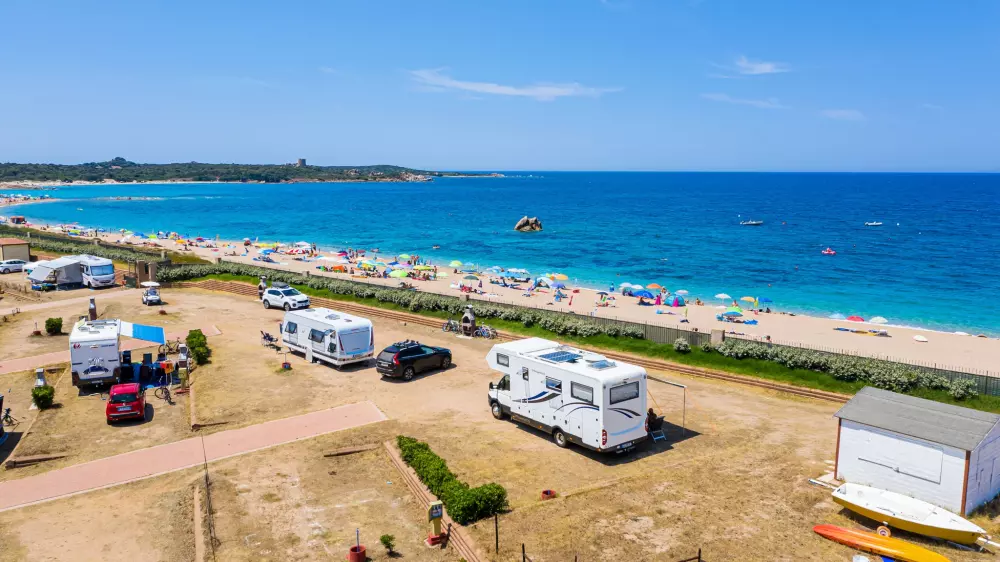 Le Camping Village, à l'ombre des pins maritimes, donne directement sur la plage, offrant le spectacle coloré et contrasté de la mer de Sardaigne.