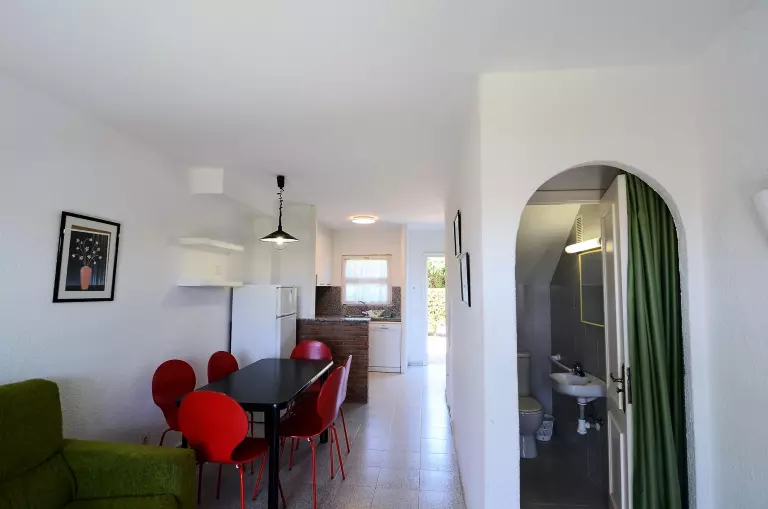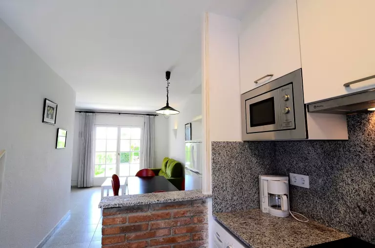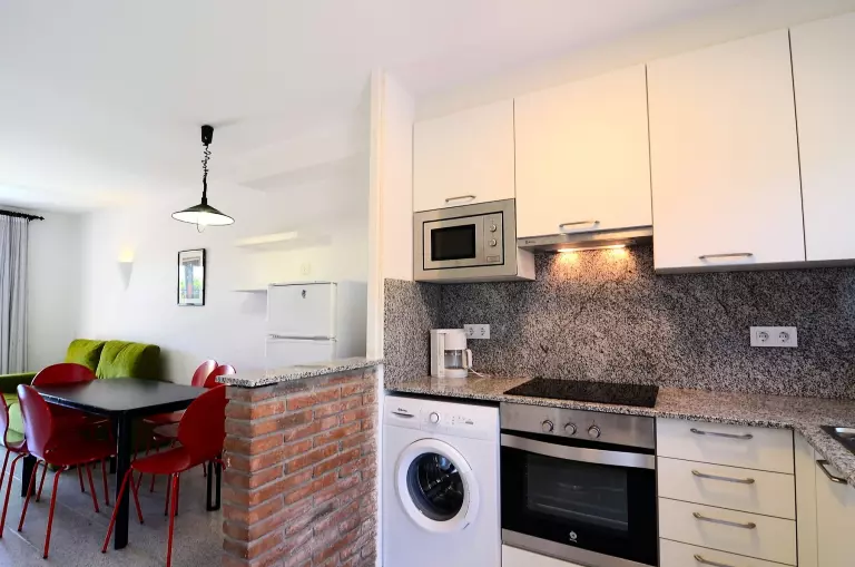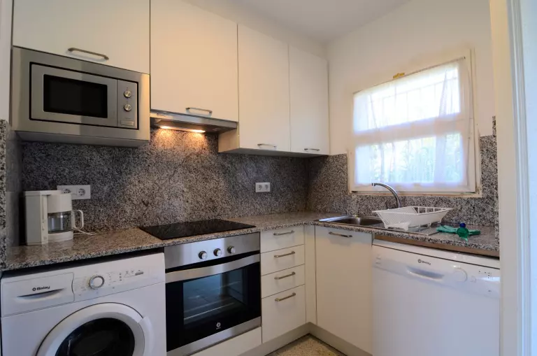 À l'intérieur, la cuisine ouverte avec plaque vitrocéramique est entièrement équipée d'équipements modernes, notamment un réfrigérateur, un four micro-ondes, un four, un congélateur, un lave-linge, un lave-vaisselle, une cafetière, un grille-pain et un presse-agrumes. L'agence met également à disposition un accès Internet selon disponibilité (10€/jour).