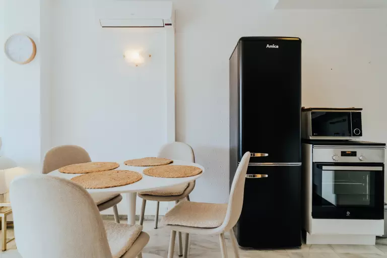 L'espace cuisine, bien que compact, est équipé de tout le nécessaire pour préparer de délicieux repas. Une petite table à manger est idéale pour prendre un café le matin ou un dîner romantique.