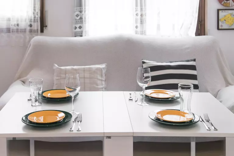 La cuisine-salon est entièrement équipée et pourvue d'un canapé-lit confortable et d'un téléviseur, créant un endroit idéal pour se détendre et se divertir. La zone de repas s'y trouve également, où l'on peut savourer de délicieux plats.