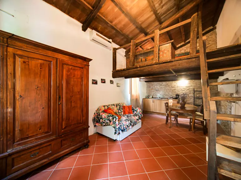 "Galatea" studio 31 m2, au rez-de-chaussée. Aménagement rustique: séjour/salle à manger avec douche/bidet/WC et TV. Sortie sur le jardinet. Galerie avec 1 lit double. Coin cuisine (2 plaques de cuisson). Air-conditionné, chauffage à air chaud. Petit jardin. Meubles de terrasse. A disposition: Internet (Connexion WIFI, gratuit). Place de parking près de la maison. Veuillez noter: réfrigérateur sans compartiment congélateur. Maximum 1 animal/ chien autorisé. Entrée privée. IT041044B5Y9YW5KOX