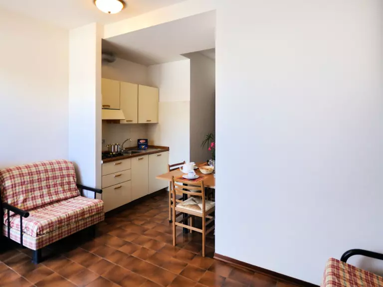 Studio 25 m2, à l'étage supérieur. Clair, aménagement fonctionnel: séjour/chambre à coucher avec 3 couchages, table pour les repas, coin-cuisine et TV (satellite). Sortie sur le balcon. Coin cuisine (Poêle à gaz, 4 feux, micro-ondes, cafetière électrique). Douche/WC. Air-conditionné, chauffage à air chaud. Balcon. Mobilier de balcon. A disposition: chaise haute pour enfant, lit bébé (en sus). Internet (Connexion WIFI, gratuit). Garage sur le terrain (1 Voiture) près de la maison. Maximum 1 animal/ chien autorisé. Cette location est un exemple de location / d'appartement. IT027034C2DKSL2WCA
