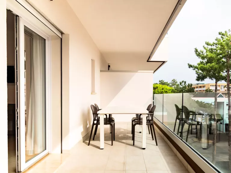 Résidence confortable "Iris Suite", de 5 étages, année de construction 2021. 16 appartements dans la résidence. Dans le quartier de Bibione Spiaggia, à 100 m du centre de Bibione, à 13 km du centre de Lignano, à 100 km du centre de Venezia, à 450 m de la mer, à 450 m de la plage. En commun: terrain (clôturé), piscine (6 x 6 m, disponibilité saisonnière: 15.Mai. - 15.Sep.). Infrastructures de la résidence: ascenseur, terrasse ensoleillée. Supermarché 230 m, arrêt de bus 450 m, gare ferroviaire "Latisana" 21 km. Attractions à proximité: Oasi Naturalistica Val Grande - Bibione. La photo n´est qu´un exemple. Terrasse sur le toit d'environ 120 m² avec piscine, chaises longues et coin salon à partager.